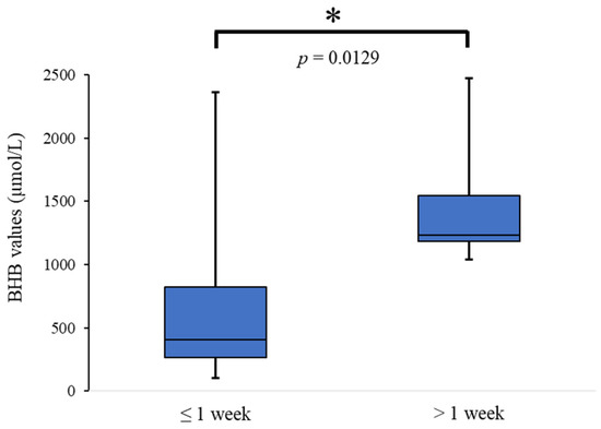 Comparison of BHB values between the PMI of ≤1-week and >1-week groups. The median values are significantly higher in the PMI of the >1-week group than in the PMI of the ≤1-week group. * means statistical significance (p < 0.05). BHB; β-hydroxybutyrate.