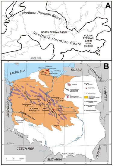 Studied Zechstein potash-bearing deposits in Poland. (A) Extent of the European Permian Basin with the area studied (after []). (B) Sites of analysed potash-bearing deposits.
