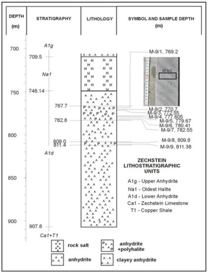 Sampled profile of Mieroszyno M-9 borehole with polyhalite interbeds within the Lower Anhydrite (A1d) unit. M-9/1, 769.2—sample number and depth in metres, in frame—thin section (sample M-9/2) on Figure 11.