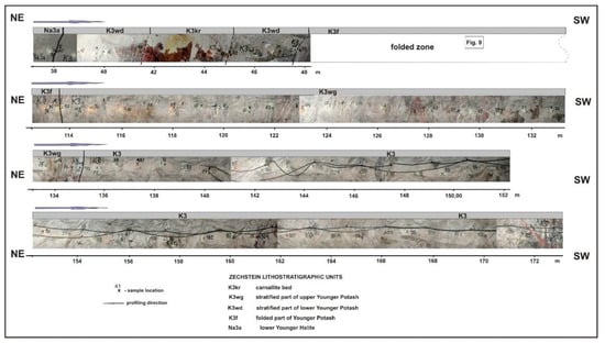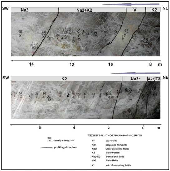 This potash-bearing complex was sampled (187) in two galleries located at mine levels 600 m and 750 m of the underground salt mine KŁODAWA S.A. [,]: Z3/1 profile (109 samples) and Z3/2 profile (78 samples; Figure 10). They are supplemented by geochemical data of six samples taken from two other galleries there [].