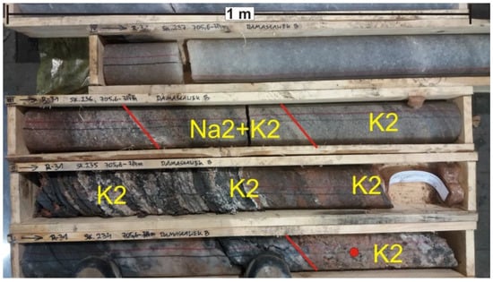 Core of Older Potash (K2) and Transitional beds Na2+K2 units in the profile of Damasławek B well, depth interval 705.6–709.6 m. Red point—sample.