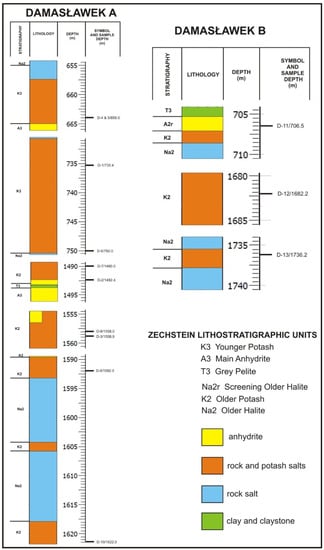 Sampled parts of the Damasławek A and B boreholes profiles with Na2+K2, K2, and K3 lithostratigraphic units, Damasławek salt dome.
