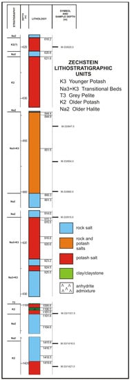 A stratigraphy of the selected evaporite Zechstein rocks with studied potash-bearing deposits is presented in Table 1.
