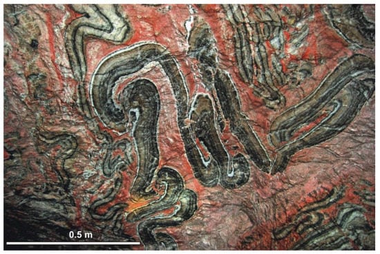The Transitional beds Na3+K3 in the Kłodawa dome, ca 14.7 m thick, are built by grey fine crystalline rock salt, rhythmically stratified with fine and several thicker (0.3–5.3 m) beds of kieseritic carnallite. The Younger Potash (K3) unit, 20–120 m thick, is composed of interbeds of: (a) fine to medium crystalline rock salt, stratified with clay matter + anhydrite laminae and with laminae and nests of kieseritic carnallite, as well as (b) kieseritic carnallite layers with nests of coarse crystalline and transparent giant halite []. This potash unit is highly folded (Figure 9) in the central profile part (Figure 10).