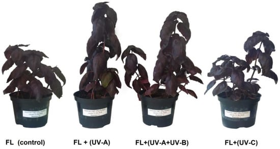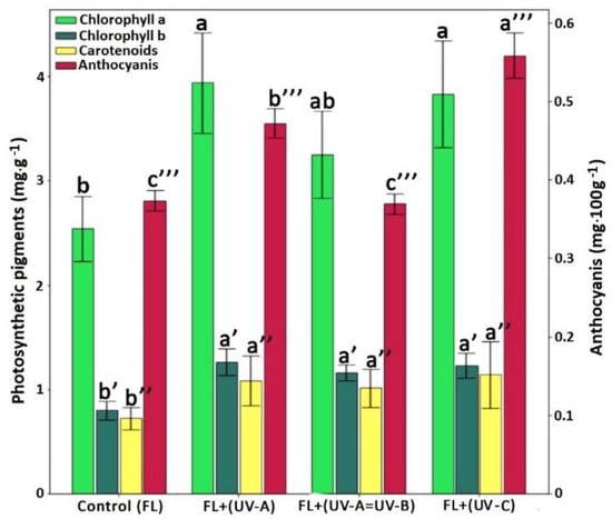 Exposure to additional UV-A and UV-B irradiation significantly influenced the content of chlorophyll a and b and carotenoids (Figure 2), which, however, was not consistent with other studies [43,44]. The significant increase in the total amount of anthocyanins was observed under additional UV-A and UV-C irradiation. The increase in the content of photosynthetic pigments in plants can be due to the activation of protecting mechanisms against UV irradiation [45,46].