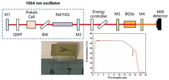 A large-size BGSe crystal (shown in the inset of Figure 1) with dimensions of 8 mm × 8 mm × 15 mm was used as the nonlinear optical crystal in OPO. The BGSe crystal employed was grown by vertical Bridgman method []. In addition, two zone annealing technique was used to improve the optical properties. The BGSe crystal exhibits high transmittance from 0.47 to 18 μm and low absorption coefficient of 0.042 cm−1 at 4 μm. The BGSe crystal was cut at θ = 42.5° and φ = 0° for Type I phase-matching condition (o-ee). Both sides of the BGSe crystal were well-polished and AR-coated for 1.064 μm, 1.3–1.6 μm and 3–5 μm. The crystal was wrapped in indium foil and cooled to 25 °C with brass heat sink to reduce the thermal effect in BGSe crystal. The wavelength of the signal wave was measured by a spectrometer (Agilent, 86142B, Santa Clara, CA, USA), which was used to calculated the wavelength of the generated mid-infrared wave. A dichroic BaF2 mirror (3.65–4.50 μm AR and 1.064 μm and 1.35–1.65 μm HR) was used as the long-wave pass filter. The energy of the generated mid-infrared wave was measured by a mid-infrared energy detector (Newport corporation, 919E-0.1-12-25K, Irvine, CA, USA).