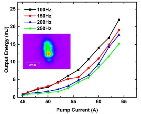 The input-output characteristics in Q-switched operation are shown in Figure 2. The maximum output energies of 22.0 mJ/pulse, 19.1 mJ/pulse, 17.7 mJ/pulse and 15.1 mJ/pulse were obtained with no saturation when the repetition rates were 100 Hz, 150 Hz, 200 Hz and 250 Hz, respectively. According to the theoretical analysis of transient thermal distribution of repetitively pumped laser by W. Koechner, the temperature in the center of the laser rod increases with the increase of the repetition rate []. Serious heat accumulation at higher repetition rate will broaden the fluorescent spectrum and shorten the upper-level lifetime, leading to the decrease of laser output. The higher pump current was not tested to avoid the damage to the Nd:YAG crystal. The lasing thresholds were about 45 A for different repetition rates. The spatial profile of pump beam at the front surface of BGSe crystal was measured as shown in the inset of Figure 2 (linear in spatial dimensions and color scale). The 1064 nm pump beam diameter was 2.5 mm (vertical direction) × 1.0 mm (horizontal direction). The spot size in horizontal direction was shorter than in vertical direction due to the aberration caused by the Brewster polarizer.