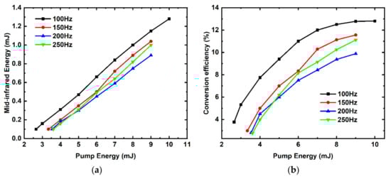 The input-output characteristics of the generated mid-infrared wave at 4.06 μm with different repetition rates are shown in Figure 3a. With the increase of repetition rate, the LIDT decreased rapidly. When the repetition rate was above 150 Hz, damage on the surface of the BGSe crystal was observed with pump energy higher than 9 mJ/pulse (corresponding to peak intensity of about 20 MW/cm2). For higher repetition rate of 500–1000 Hz, optical damages were much more intense, which limited the further improvement in the repetition rate of the BGSe-OPO. The LIDT is lower than our recent report on the low repetition rate (10 Hz) experiment []. The thermal effect caused by the extra crystal absorption to the pump wave and the relatively low beam quality from the side-pumped laser were other possible reasons.