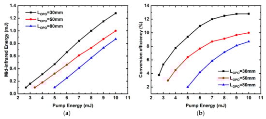 The influence of the OPO cavity length to the input-output characteristics were studied at 4.06 μm with the fixed repetition rate at 100 Hz, as shown in Figure 4a. For different cavity lengths of 30 mm, 50 mm and 80 mm, the maximum output energies were 1.28 mJ/pulse, 1 mJ/pulse and 0.87 mJ/pulse, respectively. With the decrease of the cavity length, the transit period of the signal wave in the OPO cavity would decrease, which was beneficial to the interaction between the pump and the signal wave and led to the increase of the mid-infrared output energy.