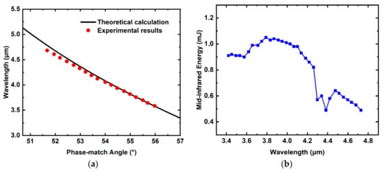 The experimental results fit well with the theoretical calculation in Figure 5a. Figure 5b shows the tuning output characteristics of the BGSe-OPO. The tunable output decreased at both sides of the tuning curve due to the increasing pump loss from the Fresnel reflection. The abnormal valley of the tuning curve in Figure 5b around 4.34 μm was deduced to be related to the crystal impurities and defects.