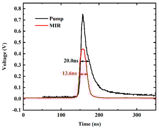 Figure 6 shows the temporal pulse profiles of the pump wave and the mid-infrared wave, measured by Si photodiode (Thorlabs, DET025A/M, Newton, NJ, USA) and (HgCdZn) Te photodiode (Vigo, PCI-9, Ozarow, Mazowiecki, Poland), respectively. With the rapid decline of pump intensity at the trailing edge, the pulse width of the mid-infrared wave (13.6 ns) was measured to be shorter than the pump wave (20.0 ns) [].