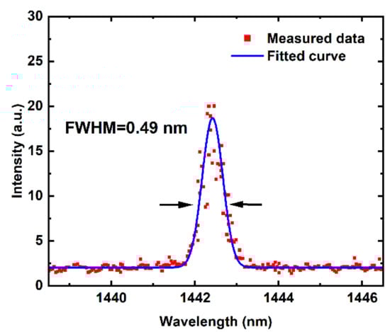 The spectrum of signal wave at normal incidence was recorded by a spectrometer, as shown in Figure 7. The Gaussian fitted curve has a full width at half maxima (FWHM) of 0.49 nm with a central wavelength of 1442.42 nm. According to the phase-match condition, the FWHM of generated mid-infrared is estimated to be 3.92 nm at 4061 nm, much narrower than the 2 μm pumped degenerate parametric conversion [].
