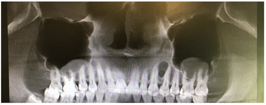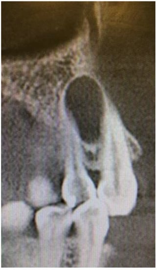 LPC can be easily diagnosed based on radiological and clinical symptoms [1,2,3,4,5]. Most often, its location between anterior/premolar mandibular tooth roots is found as a typical sign of this cyst. Some authors hypothesize that because of an LPC’s close relation with root surface, a possible origin from the cell rests of Malassez could be important [3,5]. Rarely, its atypical features, such as cortical expansion or tooth displacement, occur. An additional CBCT is mandatory to establish close features of the lesion [5,6,7,8]. According to Altini et al. and Shear et al., cortical plate expansions should always be carefully examined, especially in any case of GOC/BOC or any other appearances of irregular lesions in classic radiographs [3,5]. On the other hand, to fully establish the degree of bone loss and direct proximity of vital teeth, maxillary sinus or nerve/artery branches, in any cystic lesion, a CBCT is nowadays a gold standard of diagnostics, which is also confirmed by Chrcanovic et al. [8]. In cases of tooth resorption and irregular bone lesions, other odontogenic or non-odontogenic cysts or tumors can be suspected [7,9]. Usually, LPC is diagnosed accidentally during routine control radiograph, which is well described in most cases [12,13,14,15]. Rarely, atypical situations might occur, including its inflammation, huge size, and atypical location between crowns or opposite to the buccal side. Secondary infection in LPC is rare, and might be related with as surrounding teeth remain non-vital because of damage to the apex vital structures [5,6,7,8,9,10,11,12].