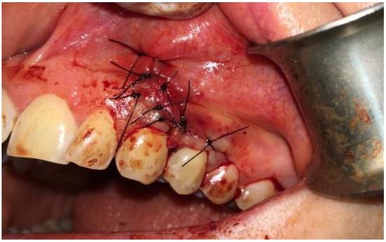 Intraoperative photograph with sutured collagen membrane onto xenograft bone with iPRF.