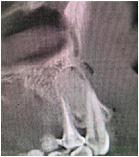 Cone beam computed tomography (CBCT) evaluation revealed the perforation of the buccal cortical bone plate, with expansion towards soft tissues, measuring about 6 mm at longest diameter (Figure 3 and Figure 4). Palatal bone plate remained without any lesions. Because of close proximity to the apex of first premolar and scheduled enucleation with bone curettage/drilling, a decision of endodontic treatment 24 was scheduled. Secondly, such treatment was also indicated because of (1) the loss of cortical plane (possible local aggressiveness of lesion), (2) possible GOC/BOC or other dental-related cyst/tumor occurrence; (3) possible teeth pulp necrosis/inflammation after extensive curettage/bone drilling used for local radicalization protocol; (4) minimizing the time needed for secondary surgery if such would be necessary in case of other pathology. On CBCT further evaluation, a slight sclerotic border close to both tooth apex/roots was visible. Teeth structure remained preserved, with only the buccal cortical bone perforation. On the floor of the left maxillary sinus, a retention mucous cyst was seen; however, due to the clinical irrelevance, only a laryngologist consultation was scheduled.