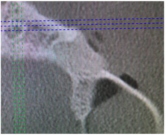 CBCT axial view directly after surgery to evaluate buccal bone plate restoration.