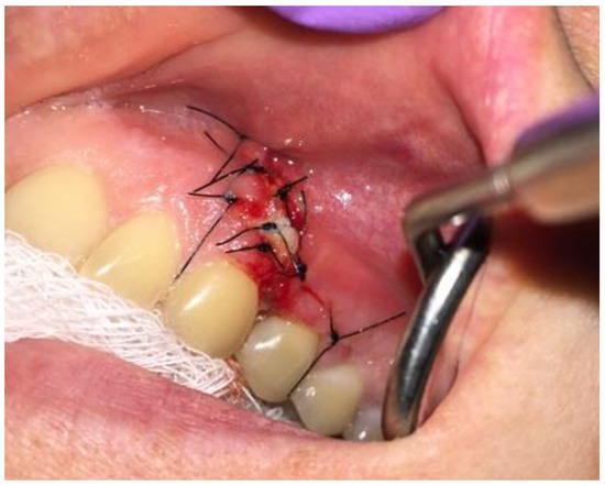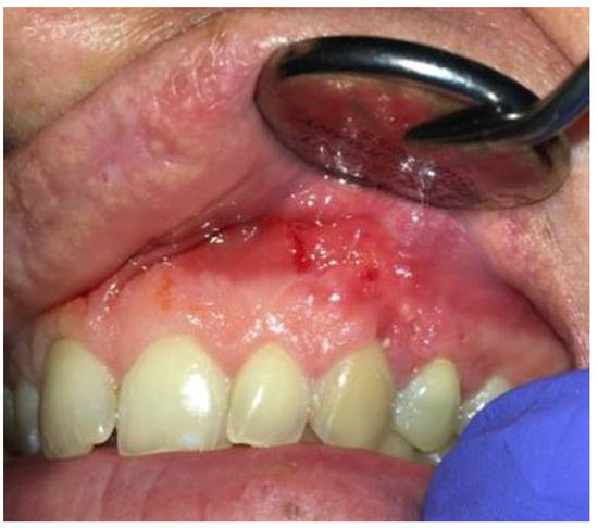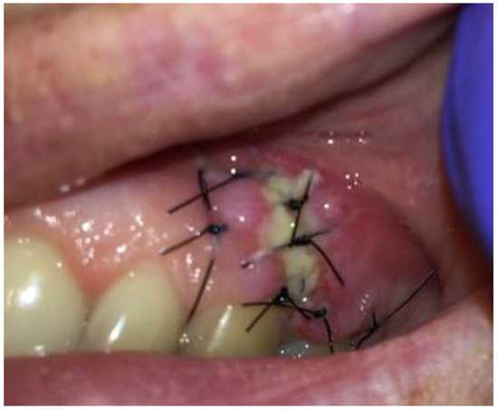 After-surgical wound care included 3 times per day rinsing with 0.1% CHX solution-Eludril 0.20% (Pierre-Fabre Oral Care); 3 times per day H2O2 hydrogen peroxide 3% (HascoLek, Wrocław, Poland) and appliance for sleep CHX gel solution on the wound. After local wound dehiscence, additional Solcoseryl dental adhesive paste (Meda Pharma, Solna, Sweden) was used to improve wound granulation (Figure 8). Wound hygiene was maintained for 14 days.