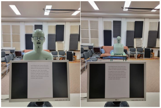Visual stimulus was used in the experiment to create an illusion of a virtual speaker/interlocutor speaking to the test subject in the listening experiment, and a virtual listener/interlocutor being read to by the test subject in the reading part of the experiment. Due to the SARS-CoV-2 pandemic and all the epidemiological countermeasures that were in force at the time, the decision to use a real person as the visual stimulus had to be abandoned to reduce health risk to a minimum. Instead, a dummy head was appropriately clothed and then put on a small trolley, thus being placed at the height of a standard sitting person. Moreover, the trolley provided an easy way of placing the dummy head at predetermined positions in front of the test subject, or to move it out of sight when no visual stimulus was required. Two positions of the visual stimulus, as viewed from the listener position, are shown in Figure 1.