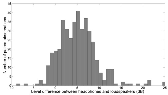 To further analyze this finding, the difference between the A-weighted levels of speech listened over headphones and loudspeakers was calculated for every pair of corresponding observations (the same visual stimulus and the same voice, for each listener). Thus, a total of 420 pairs of observations were obtained, and the same number of difference values. These values are shown in Figure 2 as a histogram.
