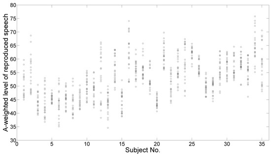 To do so, a visual examination was made by plotting every observation (A-weighted level) made by each subject. The observations collected in the listening part of the experiment are shown on the chart in Figure 3, whereas the ones collected in the reading part of the experiment are shown in Figure 4. For a simpler and clearer comparison, both charts use the same range of the A-weighted levels on the y-axis.