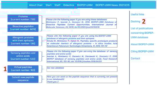 Screenshot of the current homepage of the BIOPEP-UWM database. (1) BIOPEP-UWM Virtual tab; (2) links to programs for molecular docking.