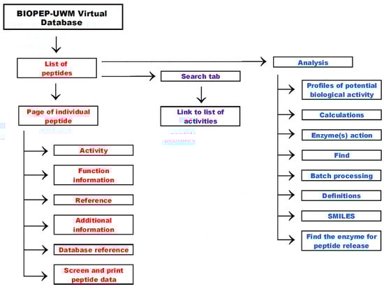 Scheme of the organization of the BIOPEP-UWM Virtual database. Due to the fact that the layout of the new database is identical to the BIOPEP-UWM database of bioactive peptides described in our previous article [], the Figure is adapted from the above reference.