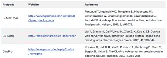 Bioinformatics represents a set of standard methods applied in research on peptides, including those of food origin [,,]. Recently, the importance of the computational approach has been highlighted in, for example, the search for anti-SARS-CoV2 peptides [,,]. The in silico approach includes molecular docking studies of peptides, which appear to be an emerging tool for predicting the bioactivity of food peptides [,,,,]. Its application for educational purposes has been recently described by Khan and coworkers []. Molecular docking is usually deployed together with experimental confirmation of biological properties of molecules, e.g., enzyme inhibition potential, but there are also investigations restricted to computational predictions. Another experimental model includes the in silico screening of many compounds, of which only one or a few of the most promising are then subjected to laboratory testing. Although in silico predictions are not fully equivalent to experimental works, they provide valuable information about the biological functions of compounds. However, critical interpretation of such results is always necessary. Strong and weak points as well as opinions concerning computational predictions of bioactivity of chemical substances have been recently discussed by Medina-Franco et al. []. Taking into account the pros and cons of in silico predictions concerning bioactive peptides, they may be annotated in a separate database.