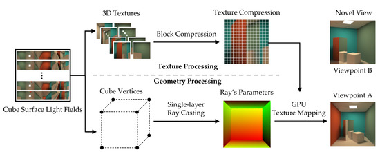 The rendering of the cube surface light field can be achieved by a general cube geometric proxy which can be rendered by the traditional rasterization or ray casting algorithm. To improve the computational efficiency of the ray parameters, we use a ray casting algorithm for fast ray computation of the cube surface light field and use GPU 3D texture mapping to convert light rays into pixel colors in the frame buffer. The rendering framework, as shown in Figure 1, mainly includes texture processing and geometry processing.