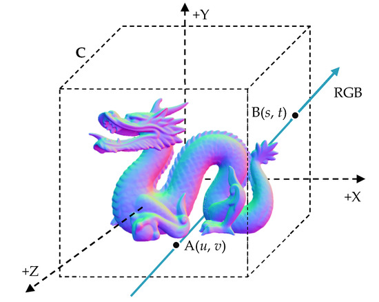 On the cube surface, the origination of each light ray is defined by the 2D coordinates at the first intersections with the light rays and the cube surface, and the directions of the light rays are defined by the 2D coordinate at the second intersections with the light rays and the cube surface. The color values of each light ray are defined as the color at the first intersections with the light rays and the scenes, which are described by the RGB color representation. Consequently, the cube surface light field can be defined as a set of RGB color values of the light rays parameterized by the intersection pairs with a specific cube surface, as shown in Equation (2), in which m and n refer to the serial number of the sub-plane where the originations and directions of the light rays are parameterized. Similarly, (u, v) and (s, t) refer to the 2D coordinates of arbitrary interior points on the m-th sub-plane and on the n-th sub-plane, respectively.