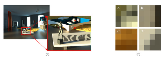 The color similarity within pixel blocks in a single image (with permission from Ref. [35]). (a) the selected four pixel blocks: A, B, C and D, (b) the enlarged pixel details for each block.