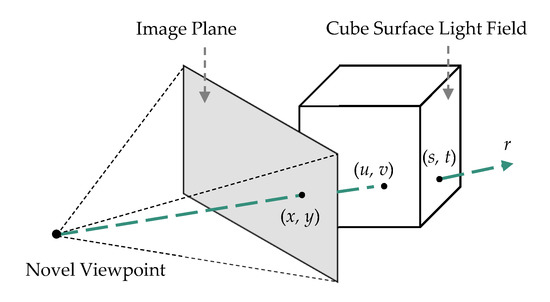 Intuitively, the texture coordinates can be used to further simplify Equation (2), resulting in the final representation of the cube surface light field denoted by Equation (3). Seeing from the dimension of u and v, each coordinate (u, v) represents a set of light rays from a fixed position, which can be described as a light field sub-view like in the traditional 2PP light field representation. Meanwhile, seeing from the dimension of s and t, each coordinate (s, t) represents a set of light rays from a fixed direction, which can be described as a sub-aperture image like in the 2PP light field representation.