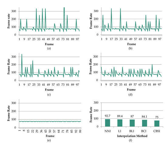 The time performance of rendering the cube surface light field using different interpolations. (a) NNI, (b) LI, (c) BLI, (d) BCI, (e) CBSI, (f) the average frame rate of each interpolation method.