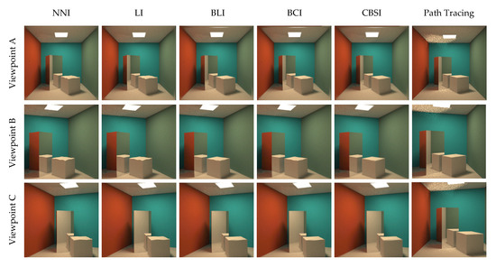 As can be seen from Figure 9, the rendering results by the cube surface light field can reconstruct the global illumination effect of the scene. Especially, a more accurate global illumination effect can be rendered when a more appropriate interpolation method is used. For example, the NNI rendering produces aliasing artifacts, while the CBSI rendering produces smoother images. It also proves from another aspect that our method can be used to accelerate the path tracing rendering. This is because our method records the light rays generated by the path tracing rendering in advance, and only a light ray query is needed in the rendering stage.