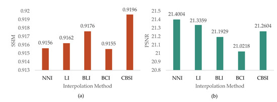 The comparisons between different interpolation methods and the path tracing rendering using (a) SSIM and (b) PSNR.