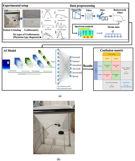 Artificial intelligence (AI) has been widely used to study and treat various diseases. The study of Zeeshan Hameed et al. [12] illustrated that AI diagnosis is feasible in urology, regardless of disease severity—from benign prostatic hyperplasia to critical diseases such as urothelial and prostate cancers. Therefore, using AI technology to detect, assess, and treat urological diseases is superior to all the existing traditional methods. Eun et al. [13] indicated the possibility of the modern application and development of AI in urological research, especially in the diagnosis and treatment of urological diseases. Machine learning algorithms will improve the accuracy of predictions for various bladder diseases, including interstitial cystitis, bladder cancer, and reproductive urology. The application of AI leads to a higher accuracy of disease diagnosis and prediction models to monitor accurate decision making in medical treatment. Qureshi et al. [14] used general neural network (ANN) and convolutional neural network (CNN) methods to effectively solve the problem of female urinary incontinence diagnosis and management. Jin et al. [15] combined MFCC with a convolutional neural network (CNN) and developed a psychoacoustic model to measure automotive transmission noise perceived by humans. Cuocolo et al. [16] used machine learning (ML) to read prostate magnetic resonance imaging (MRI). This study compares the ML method with traditional methods. Many clinical applications of MRI do not segment glands, which limits their effectiveness in detecting, diagnosing, and locating cancer. In this study, the particular novel ML model incorporating ML and deep learning (DL) is proposed to highlight the differences between MRI applications in the prostate treatment pipeline. However, the validation and reproducibility of clinical applicability must be improved. Jin et al. [17] generally used non-invasive uroflowmetry to diagnose lower urinary tract symptoms (LUTS) and the patient’s health status. This study established an AI system that used acoustic features for LUTS assessment and was validated with a long short-term memory (LSTM) deep learning algorithm. The results were similar to clinical urological measurements. In the future, the system could be developed for home testing devices to realize the functions of remote continuous monitoring and diagnosis.