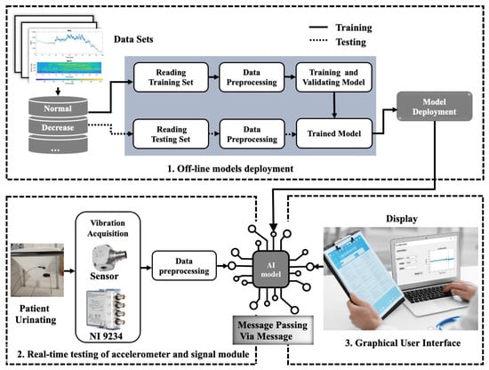 The architecture of the proposed system is shown in Figure 2. The system consists of three major components: (1) a vibration signal and deep learning-based voiding pattern classifier; (2) an accelerometer and signal extractor that performs real-time vibration signal collection and testing; and (3) a graphical user interface that displays the output. The first step developed a vibration signal dataset and trained and tested the model through deep learning, followed by data storage and deployment of the offline model. The final step performed real-time testing and displayed the results. The components of the system are described in the following sections.