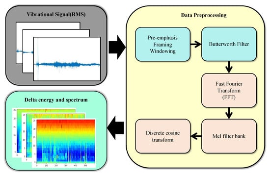 The root mean square (RMS) [26] of a sensor-generated vibration signal was used to assess the vibration level in the data preprocessing. As shown in Figure 3, the raw signals underwent pre-emphasis filtering through a Butterworth filter, were converted into the frequency domain via a fast Fourier transform (FFT) [27], and their features were extracted through the mel scale. The final step generated the spectrogram of the signals.