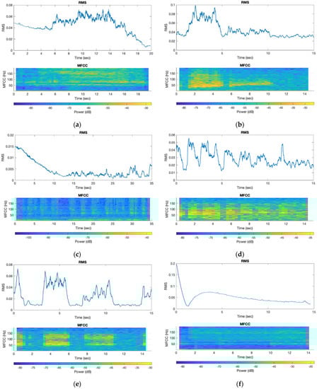 Plotting of RMS signal and MFCC spectrum of cases of six uroflowmetry patterns, including normal case. (a) The normal flow; (b) The tall and peak flow; (c) The decrease flow; (d) The saw-tooth flow; (e) The intermittent flow; (f) The flattened flow.
