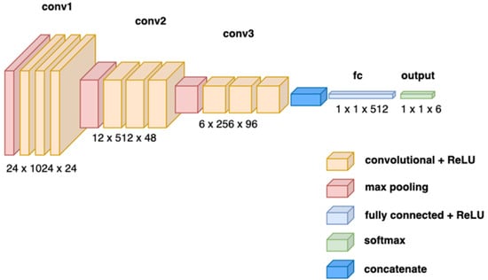 where weighting w and bias b are the updating parameters of the Full Connection layer, and the ReLU is the activation function as . For the classification of six classes, the Softmax function, as , which maps the multiple classification results of the model’s final prediction output to the elements in each vector is located within (0, 1), and the sub-intervals represent the probability distribution of each classification.