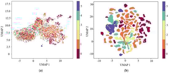 Segmentation of the raw data of the UMAP regions: (a) raw data, (b) the data extracted from the final layer output, where 0–5 represent the urinary pattern label.