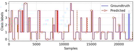 Based on the real-time urine flow monitoring, this study introduced the model to identify real-time voiding situations, and the experiment will identify and diagnose several cases based on time series. As shown in Figure 7, the red labels represent actual values in the bottom figure, while the blue curve represents model-predicted values. Sections in which the colors overlap indicate that the model had accurately predicted the classification. Because most of the lines overlapped, we can conclude that the model has excellent predictive power.