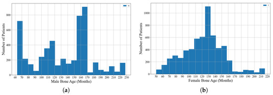 The distribution of examples in this dataset based on the ground truth bone age. (a) Age distribution of the male group. (b) Age distribution of the female group.