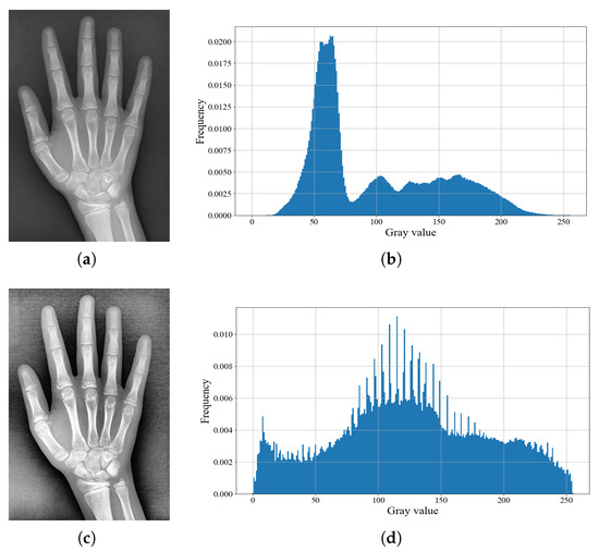 By analyzing the gray value of images, it was found that the gray distribution was inhomogeneous, which led to poor feature extraction and had a negative impact on training results. Therefore, this paper uses the histogram equalization method [31] to enhance the contrast of images. Figure 3 shows the comparison before and after histogram equalization; it can be seen that the gray value of the image is more uniformly distributed in the entire gray range, and the overall contrast is significantly enhanced, which is convenient for feature extraction. After equalization, data augmentation flips, mirrors, and rotates operations on the images.
