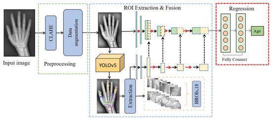 The overall process framework. It contains three major parts: (1) data preprocessing; (2) ROI extraction and feature fusion; (3) bone age prediction.