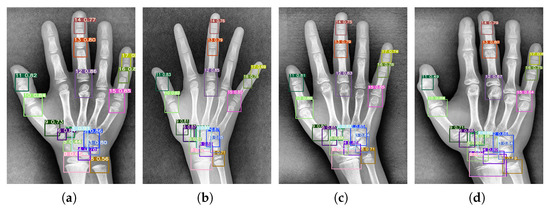 ROIs in TW3 can focus on information that is highly correlated with bone maturity. Therefore, based on TW3 evaluation criteria, 18 ROIs are detected and extracted by YOLOv5, which can ensure the trade-off of speed and accuracy. In this process, 500 images were stratified from the dataset according to the proportion of each age group, manually labeled, as well as 400 for training, and 100 for testing. The precision, recall, and F1 scores in the test set were 0.997, 0.993, and 0.996, respectively. The results of the ROI detection are shown in Figure 5. The number above the box indicates the confidence level of detection. It can also be seen that YOLO can still detect 18 ROIs even though the hand bones are immature at the age of 4. Figure 6 presents the ROI example for a 12-year-old hand bone image. Since there are images that contain both left and right hands in the dataset, and some images contain only the left hand, we performed the following operations: the raw data were passed through the detection network, and then expanded by 5 pixels according to the boundary coordinates of the 11th and 17th ROIs to crop out the entire left-hand skeleton, which was used as the input of the global network, and the corresponding 18 ROIs were used as the input of the local network.