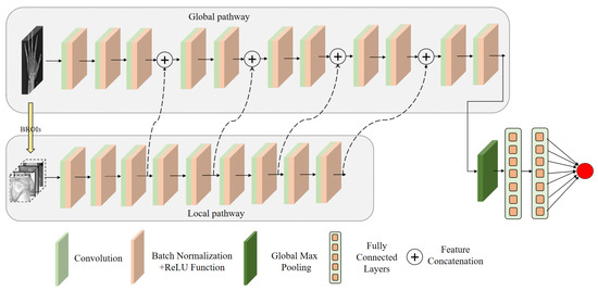 The entire process framework is shown in Figure 4. After equalization and data augmentation, an ROI detection network is used to identify ossified regions of the hand bone. These local patches are leveraged as input to the local network. Convolutional neural networks are then used for global and local networks to extract deep features from the whole image and local patches. The following sections describe each step in more detail. In comparative experiments, we also used global and local features separately for bone age prediction.