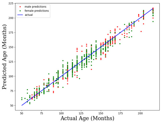 Table 3 shows the prediction results of bone age for males and females in different age groups. It can be seen that the variance in the results in the male group is greater than that in the female group. In the experimental data, females obeyed the normal distribution, while the distribution of males was not balanced, indicating that the balance of the data was conducive to improving the stability of the model. In terms of data volume, the peaks of the male and female data volumes were at 13 years old and 11 years old, respectively. This is because boys start puberty at 12 years old while girls start at 10 years old. After about 1 to 2 years of growth and development, parents pay attention to their child’s height. Since the experimental data in this paper were clinically-derived, the imbalance of distribution was unavoidable. So, in future research, we will continue to track the data to make them evenly distributed across age groups and improve the generalization ability of the model. In addition, it is worth noting that in each age group, the ages of (4, 6] were the best, and the ages of (14, 16] were the worst. From the image analysis, there were 8 ROIs concentrated in the wrist of the hand bone. In the early stage of child growth, due to the low degree of ossification development, the overlap between these blocks is low, the distinction is obvious, and it is easy for the network to learn local features, so the evaluation error is small. With growth and development, especially after puberty, skeletal ossification tends to mature, the degree of overlap increases, and some boundaries appear in two or more blocks. Meanwhile, the feature learning efficiency is low, and some feature redundancy exists, resulting in increased errors.