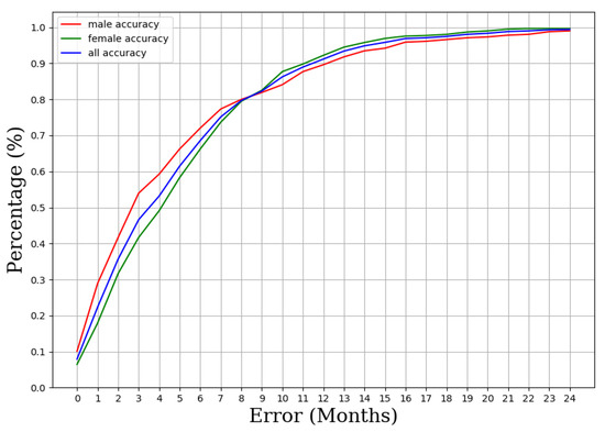 In addition, we also introduced another effective curve-based evaluation method for BAA, named cumulative percentage accuracy curve, to calculate the cumulative accuracy of prediction error within 0 to 24 months. An example is shown in Figure 9, where the horizontal axis represents the month within the prediction error, and the vertical axis represents the accuracy rate. The prediction performance of the method can be seen more intuitively from the curve. The average accuracy rate within 6 months and 12 months reached 70% and 91%.