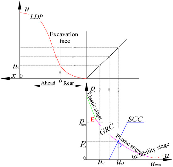 SCC: It refers to the action process of support structures with different stiffnesses. The ordinate of intersection D is the final surrounding rock pressure acting on the support structure by , and the abscissa of intersection D is the final deformation of surrounding rock by .