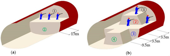 Schematic diagram of tunnel excavation: (a) Long step method; (b) Reserved core soil method. ①~④ is the excavation sequence of surrounding rock.